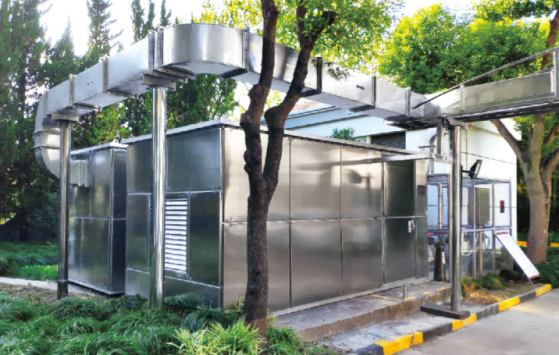 采用双介质阻挡放电低温等离子模块,在外加电场的作用下,放电产生的大量高能电子(e)轰击污染物分子,使其电离和激发,然后与其他活性粒子如氧原子(O)、羟基自由基(OH)结合,引发了一系列复杂的物理、化学反应,使复杂大分子污染物转变为简单小分子安全物质或使有毒有害物质转变成无毒无害或低毒低害的物质,从而使污染物得以降解去除。